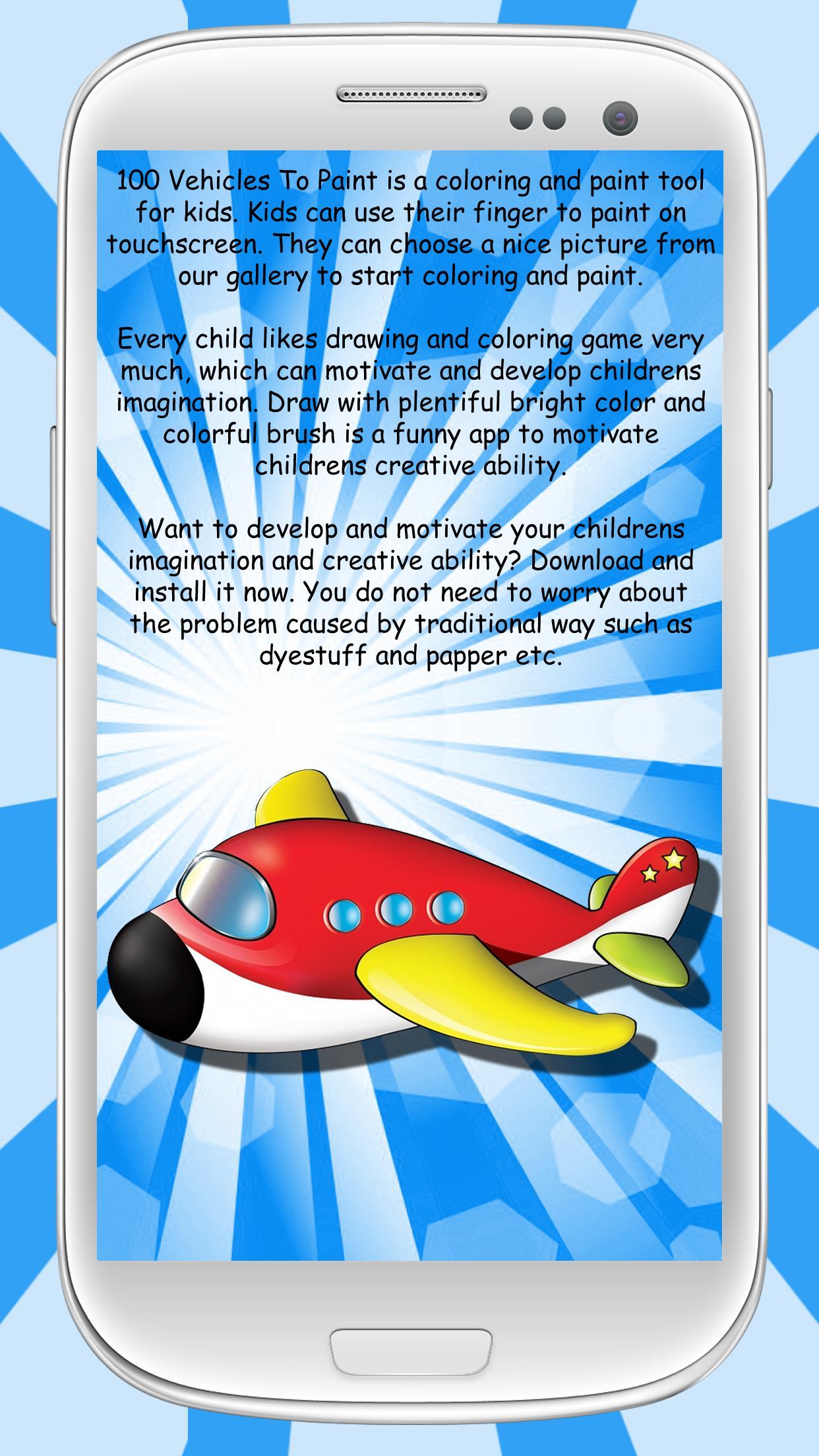 100 Vehicles To Paint sont un outil de coloration pour les enfants. Les enfants peuvent utiliser ses doigts ou un stylo léger pour colorer sur l'écran tactile de sa tablette ou un téléphone intelligent. A une large galerie où il peut y avoir une grande quantité d'images à colorer ainsi que des centaines de couleurs disponibles dans notre palette.